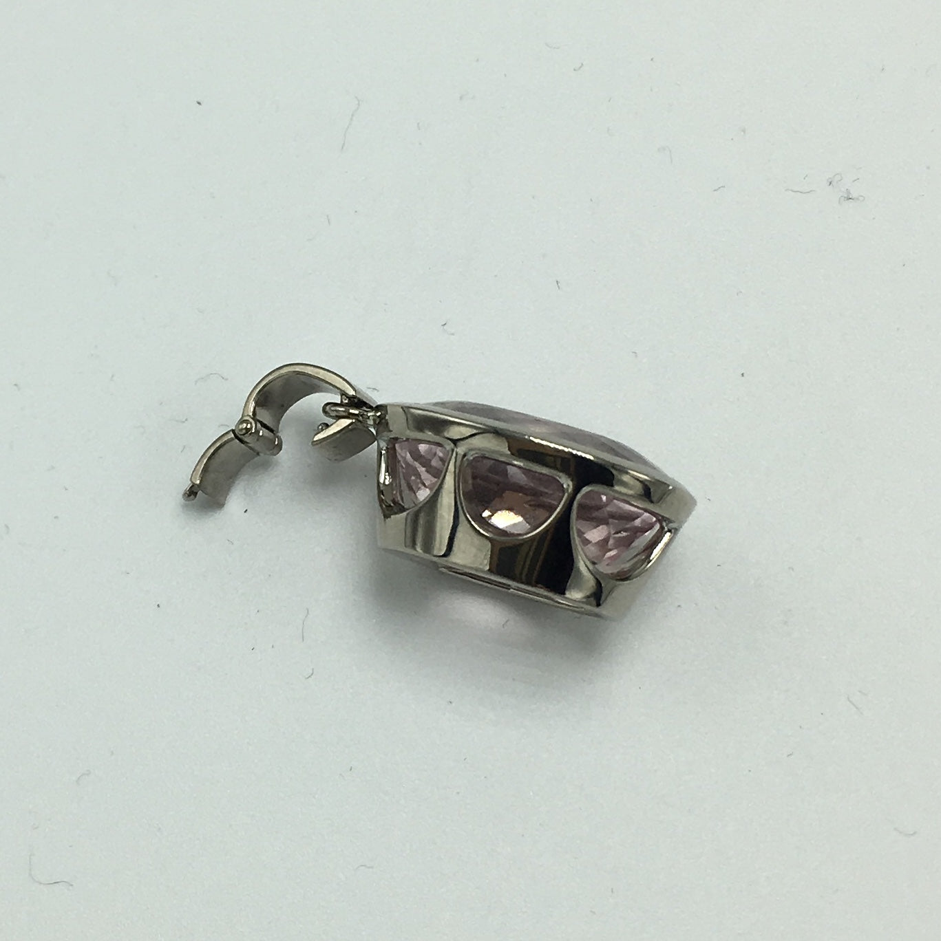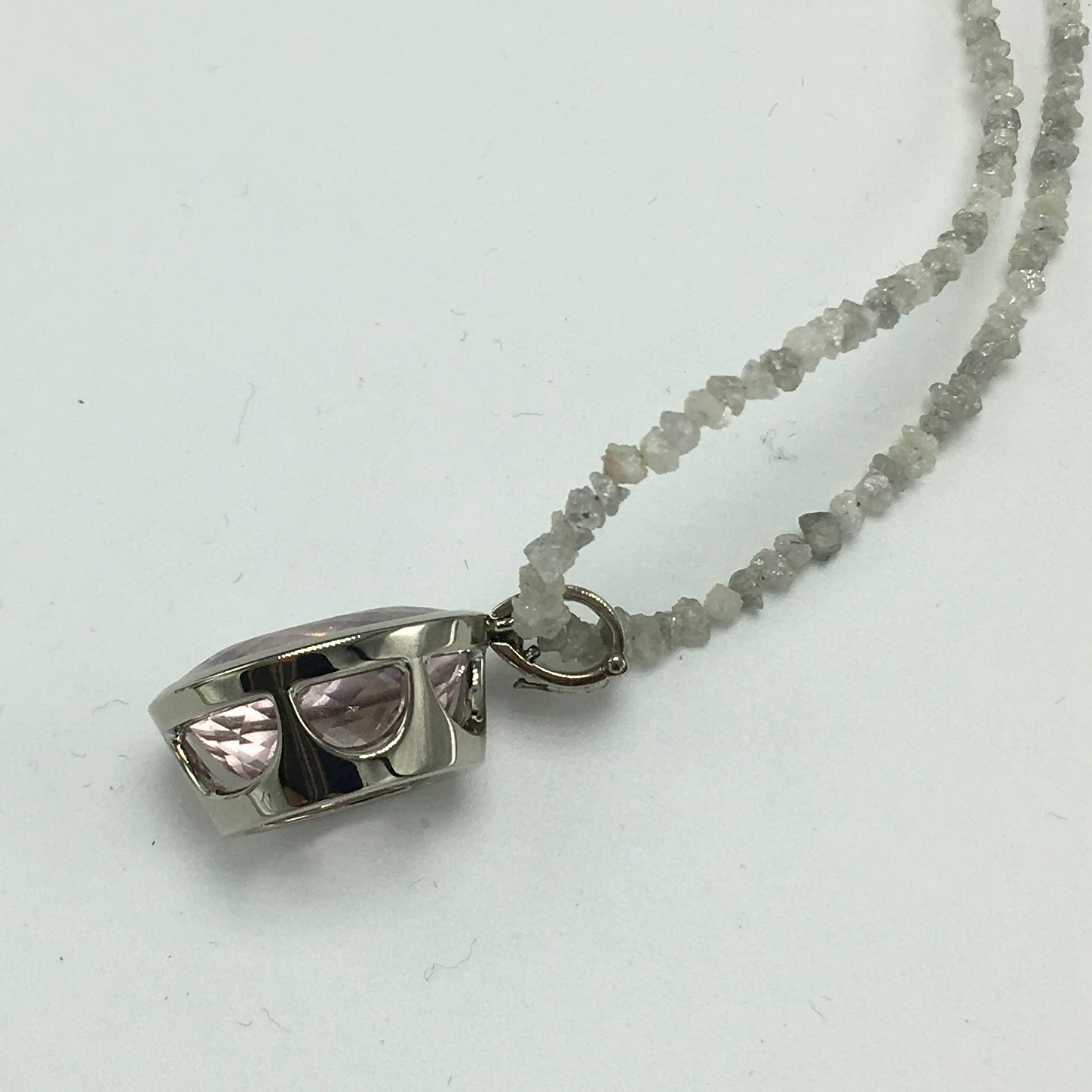 Ett drömsmycke skapat för kund – ett hänge i vitguld med en stor, ljuvlig  morganit. Hänget har en handgjord, öppningsbar ögla som gör att det kan bäras på flera sätt – till exempel på ett pärlcollier eller, som här, på ett collier av rådiamanter.