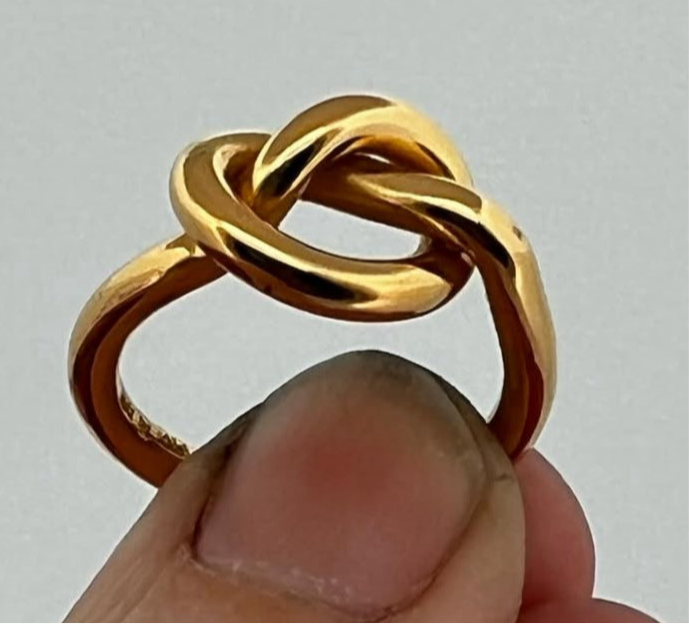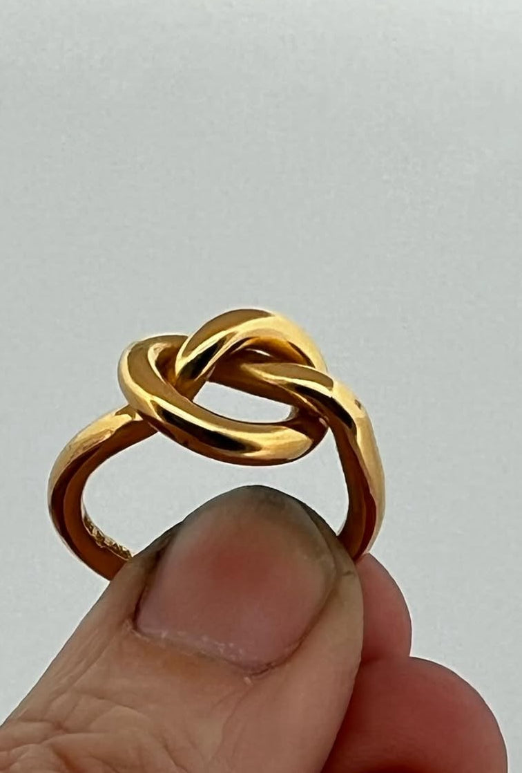 Av kundens 23k ringar skapade vi en luftig och elegant knutring. Ett nytt smycke med både stil och känsla – och med historien kvar i guldet.